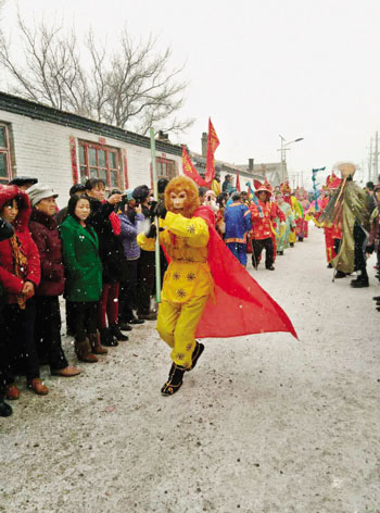 2月12日,農(nóng)歷正月初五,五寨縣前所鄉(xiāng)南坪村正在進(jìn)行的八大角秧歌表演,村民們冒著風(fēng)雪駐足觀(guān)看。圖為一村民扮演的美猴王。(許凈 攝)
