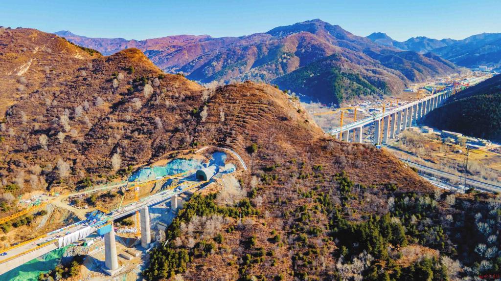 11月14日,雄忻高鐵五臺(tái)山段工程建設(shè)正在全速推進(jìn)。航拍鏡頭下,高鐵線路蜿蜒穿行太行層巒,與深秋遺韻、初冬新寒相映,盡顯基建與生態(tài)協(xié)調(diào)的壯美圖景。(記者范琛攝)
