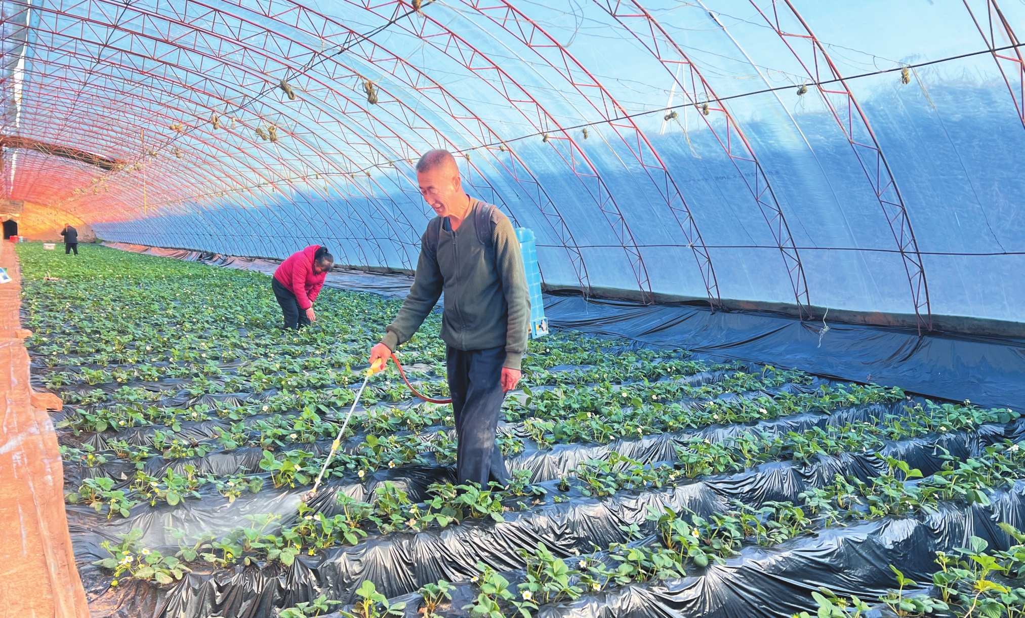 初冬寒意漸濃,河曲縣唐家會村的溫室大棚里卻充滿生機,張俊田夫婦正細致地給草莓做噴灑養(yǎng)護。(