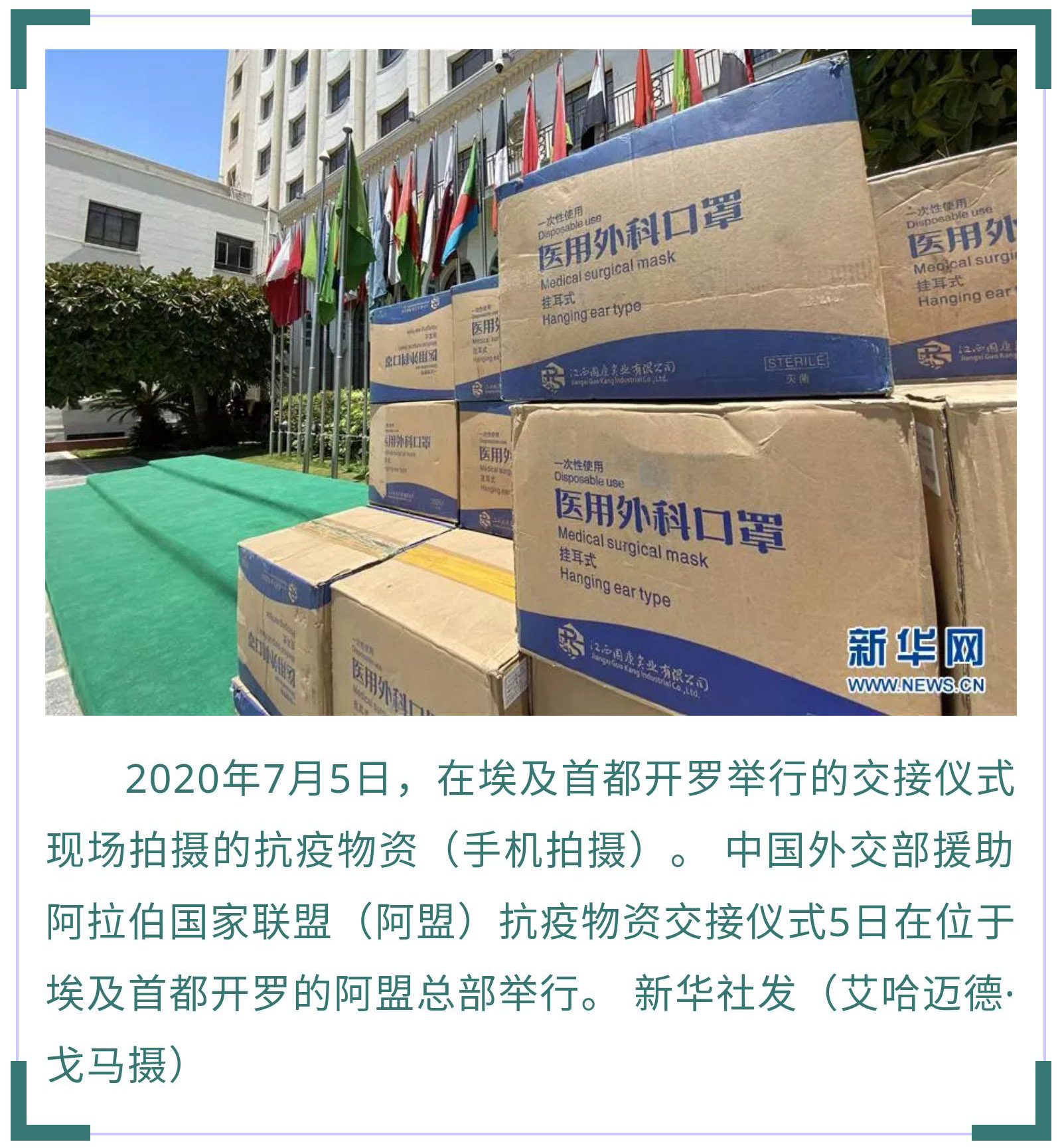 7月5日,中國(guó)外交部援助阿盟抗疫物資交接儀式在開(kāi)羅舉行。中國(guó)駐埃及大使廖力強(qiáng)代表中國(guó)外交部向阿盟副秘書(shū)長(zhǎng)胡薩姆·扎基移交了防護(hù)口罩。據(jù)廖力強(qiáng)介紹,新冠疫情暴發(fā)以來(lái),中方向阿拉伯國(guó)家援助了大量物資,毫無(wú)保留地向阿拉伯國(guó)家分享抗疫經(jīng)驗(yàn)和技術(shù),同21個(gè)阿拉伯國(guó)家舉辦了衛(wèi)生專(zhuān)家視頻會(huì)議,向8個(gè)阿拉伯國(guó)家派遣了醫(yī)療組,同時(shí)協(xié)助阿拉伯國(guó)家在中國(guó)采購(gòu)抗疫物資,支持阿拉伯國(guó)家有序復(fù)工復(fù)產(chǎn)。