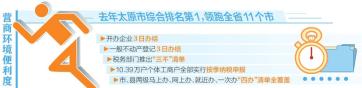 近日,記者從太原市政府新聞辦召開的新聞發(fā)布會(huì)上獲悉,山西省營商環(huán)境整體評(píng)估報(bào)告顯示,去年太原市營商環(huán)境便利度綜合排名第1,領(lǐng)跑全省11個(gè)市;在國家發(fā)改委組織的對包括直轄市、計(jì)劃單列市、省會(huì)城市在內(nèi)的41座城市進(jìn)行的營商環(huán)境評(píng)價(jià)中,太原市營商環(huán)境便利度獲評(píng)優(yōu)良。