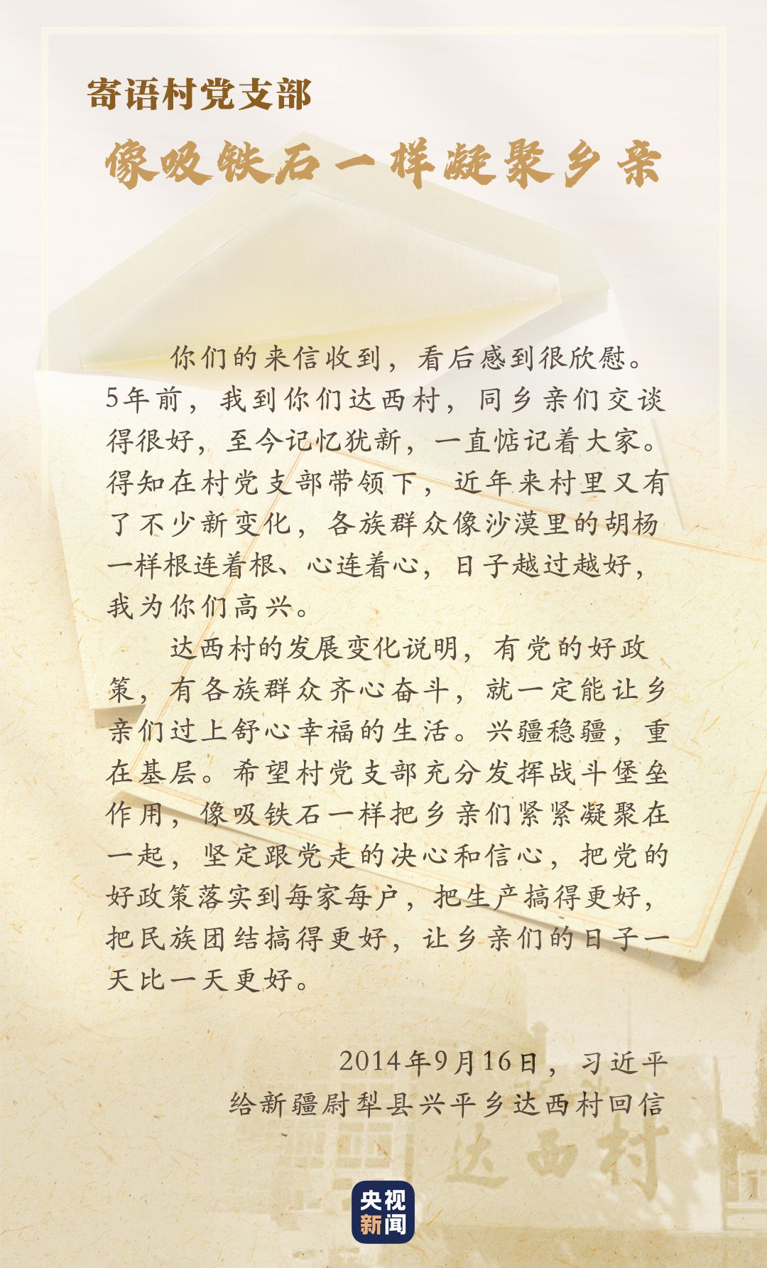 “口袋里要鼓囊囊,精神上要亮堂堂”。2014年4月,習(xí)近平在新疆考察時(shí)講到了達(dá)西村的村訓(xùn)。村民們懷著激動(dòng)的心情給總書記寫信,匯報(bào)這些年村里的積極變化。當(dāng)年9月,習(xí)近平總書記給沙吾爾·芒力克和全體村民回信,強(qiáng)調(diào)興疆穩(wěn)疆,重在基層。