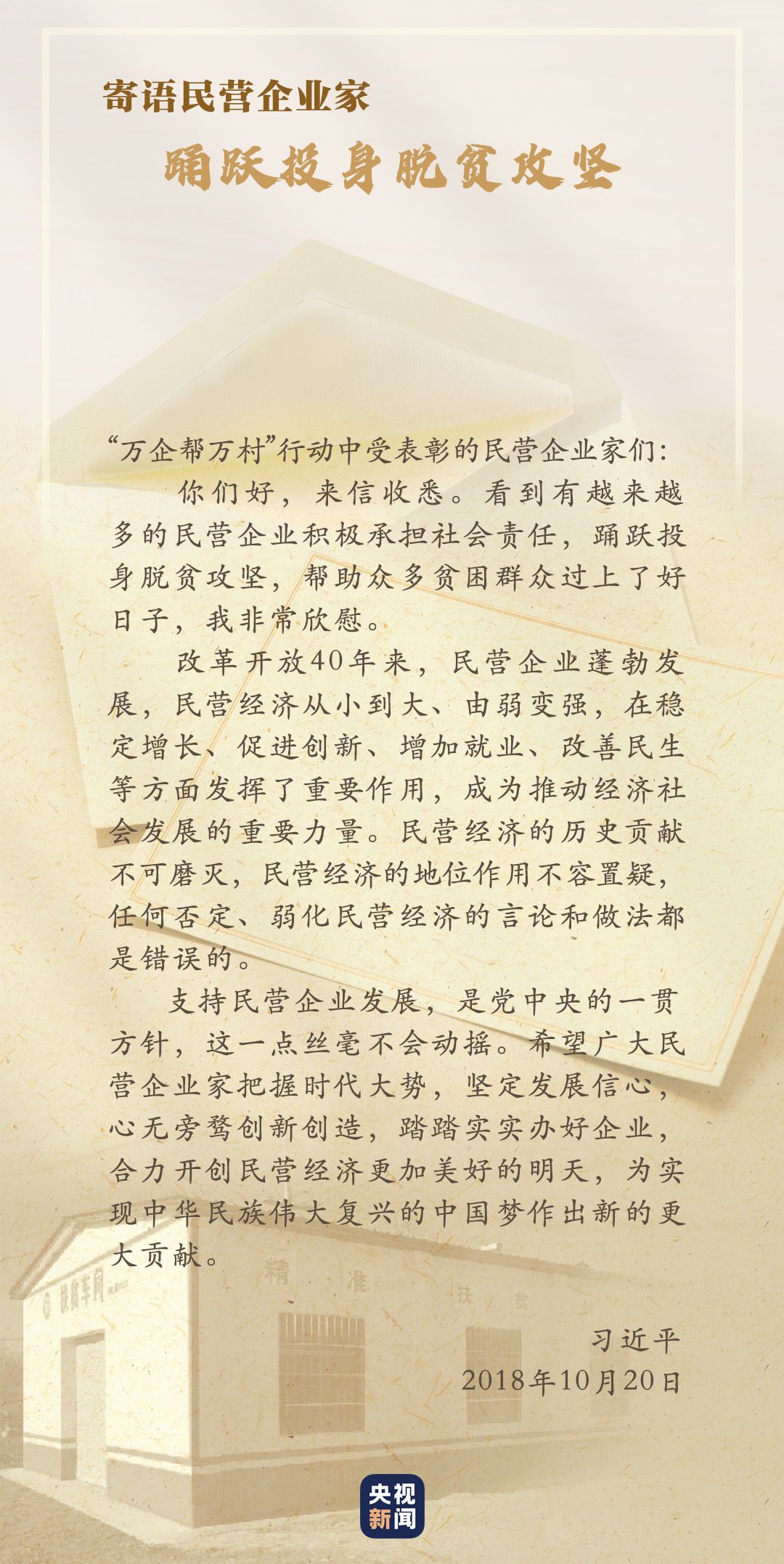 習(xí)近平對(duì)民營(yíng)企業(yè)高度重視,給“萬企幫萬村”行動(dòng)中受表彰的民營(yíng)企業(yè)家回信,對(duì)他們踴躍投身脫貧攻堅(jiān)予以肯定,勉勵(lì)廣大民營(yíng)企業(yè)家堅(jiān)定發(fā)展信心,踏踏實(shí)實(shí)辦好企業(yè)。