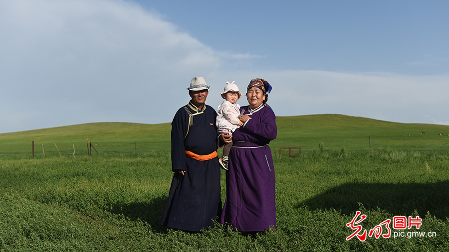 除了偶爾參加旗里的黨員活動(dòng),其日麥拉圖和老伴每日的生活就是含飴弄孫、養(yǎng)牛養(yǎng)馬,日子過(guò)得愜意又自在。圖為2020年8月2日,其日麥拉圖夫婦和小孫女在自家客廳合影留念。(潘迪攝/光明圖片)