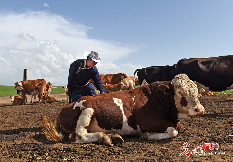 八年來(lái),其日麥拉圖帶領(lǐng)牧民投入到嘎查牧業(yè)生產(chǎn)和生態(tài)建設(shè)中,使得牧民收入逐年提高,成為全旗機(jī)械化程度最高、疫病防治和棚圈建設(shè)最好的嘎查。圖為2020年8月2日,其日麥拉圖在查看自家養(yǎng)的牛。(潘迪攝/光明圖片)