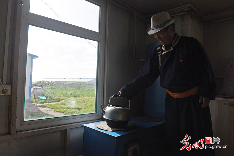 精準(zhǔn)脫貧政策實(shí)施以來(lái),在政府的幫助下,其日麥拉圖家在草原上蓋了新房子,生活用品一應(yīng)區(qū)全,其日麥拉圖一家逐漸擺脫了逐水草而居、隨季節(jié)而變的游牧生活。圖為2020年8月2日,其日麥拉圖在家里燒水。(潘迪攝/光明圖片)