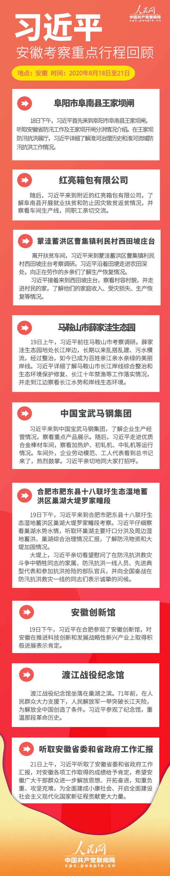 8月18日至21日,習(xí)近平來到安徽,看望慰問受災(zāi)群眾和防汛救災(zāi)一線人員,就統(tǒng)籌推進(jìn)常態(tài)化疫情防控和經(jīng)濟(jì)社會(huì)發(fā)展工作、加強(qiáng)防汛救災(zāi)和災(zāi)后恢復(fù)重建、推進(jìn)長三角一體化發(fā)展、謀劃“十四五”時(shí)期經(jīng)濟(jì)社會(huì)發(fā)展進(jìn)行調(diào)研。