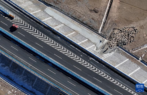 在新疆和靜縣,牧民趕著羊群從烏尉高速公路路基下穿過(12月23日攝,無人機(jī)照片)。(新華社記者 王菲 攝)