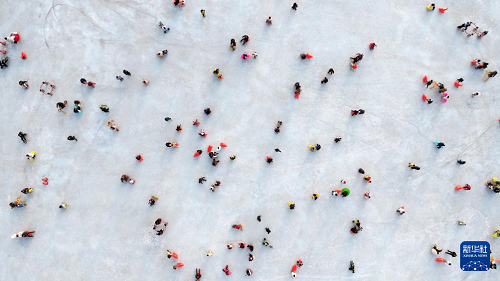 1月17日,市民在銀川文旅集團(tuán)覽山公園落日冰場(chǎng)游玩(無(wú)人機(jī)照片)。(新華社記者 王鵬 攝)