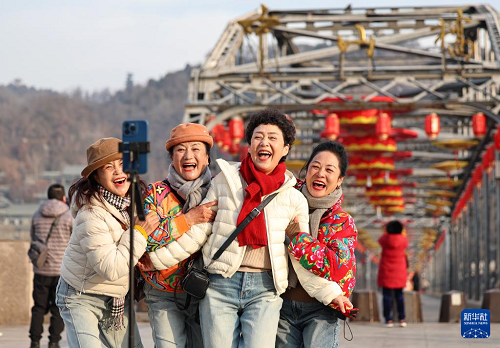 2月9日,游客在蘭州市城關(guān)區(qū)中山橋前拍照。(新華社發(fā) 侯崇慧 攝)