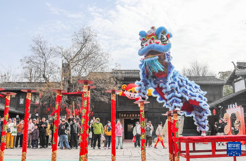 2月23日,游客在江蘇省句容市寶華山國家森林公園觀看舞獅表演。(新華社發(fā) 鐘學滿 攝)