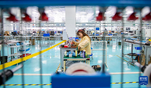 2月24日,在位于河南省商丘市睢縣高新技術(shù)產(chǎn)業(yè)開(kāi)發(fā)區(qū)的商丘中軒電子科技有限公司電子線束生產(chǎn)車(chē)間內(nèi),工人趕制電子排線外貿(mào)訂單。(新華社發(fā) 徐澤源 攝)