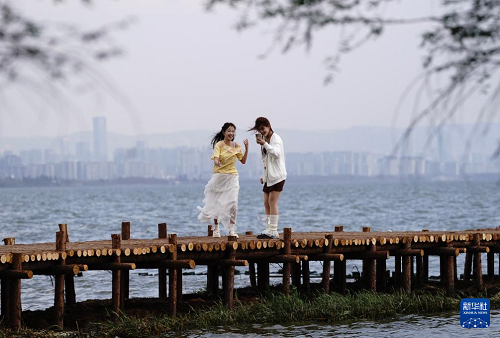 2月26日,兩名游客在滇池邊拍照打卡。(新華社記者 陳欣波 攝)