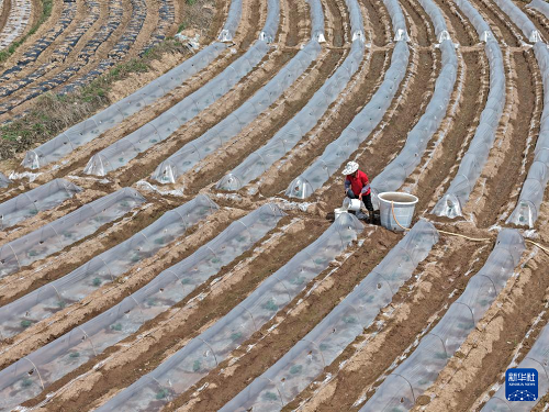 3月1日,村民在廣西南寧市邕寧區(qū)蒲廟鎮(zhèn)田園里管護(hù)(無人機(jī)照片)。(新華社記者 周華 攝)