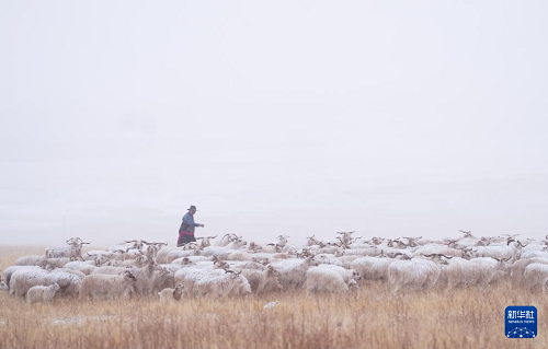 3月8日,在青海省海北藏族自治州祁連縣,牧人在雪中放牧。(新華社記者 張龍 攝)