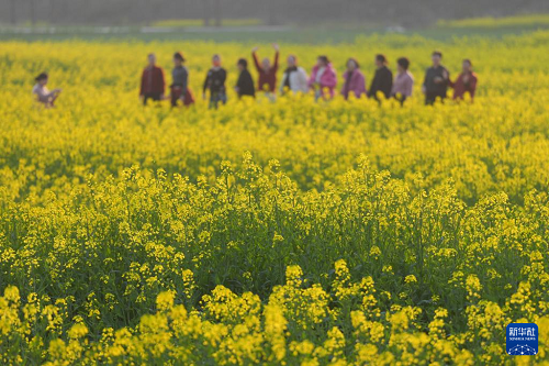 3月11日,小朋友在桐廬縣梅蓉村油菜花田間奔跑、玩耍。(新華社記者 黃宗治 攝)