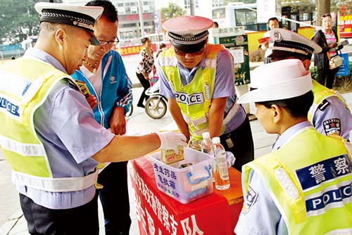考試期間,市公安局交警支隊(duì)在各考點(diǎn)設(shè)置了便民服務(wù)點(diǎn),備好遮陽傘、雨傘、保溫水桶、礦泉水和考試專用的鋼筆、橡皮。便民服務(wù)臺(tái)還放置一個(gè)小藥箱,里面?zhèn)溆星鍥鲇汀⒎朗钏?、藿香正氣水、感冒藥、腹瀉藥、速效救心丸、降壓藥等應(yīng)急藥品,以防考生及家長(zhǎng)急用。