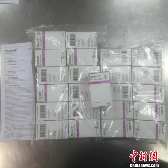 經查驗發(fā)現,背包內放置著23盒嶄新的藥物,共計1.4千克。這些藥物分四排用透明塑料紙纏繞,每個盒子內裝有一個塑料藥瓶,內有50片藥丸。藥盒上及內部的說明書均為外文印刷。在最外面包裝上,貼著用中文繁體字印刷的“毒藥”和“處方藥物”字樣。關員立刻查閱了藥品說明,發(fā)現這些藥物居然是被稱為“最強安眠藥”的氯硝西泮。