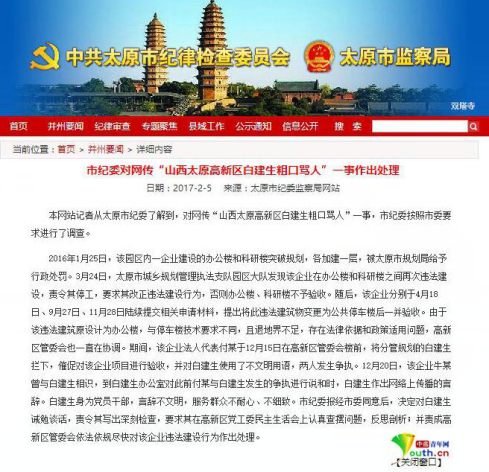 2月5日太原市紀委官方網(wǎng)站發(fā)布《市紀委對網(wǎng)傳“山西太原高新區(qū)白建生粗口罵人”一事作出處理》。