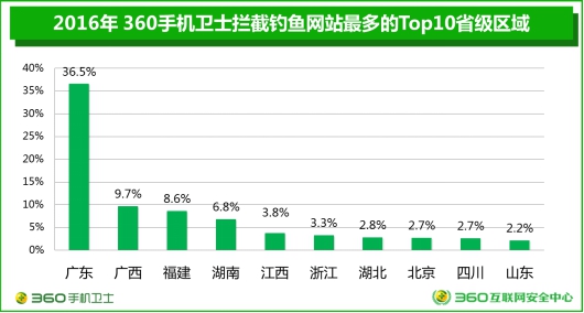360大數(shù)據(jù)對釣魚網(wǎng)站地域分布也進(jìn)行了精準(zhǔn)分析,整體來看,手機端釣魚網(wǎng)站攔截量占比最高的地區(qū)為廣東省,以壓倒性的36.5%位居榜首;其次為廣西(9.7%)、福建(8.6%)、湖南(6.8%)和江西(3.8%)。