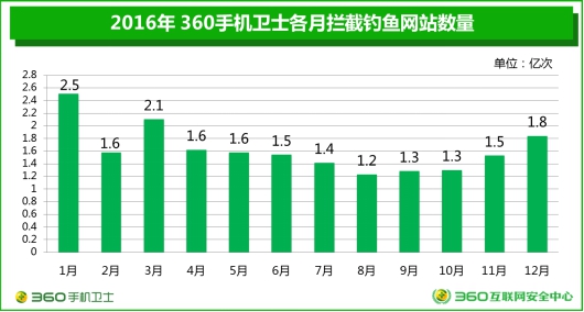 釣魚網(wǎng)站的活躍期也存在差異。360專家表示,綜合2016年各月的釣魚網(wǎng)站攔截量情況,可以看出全年的釣魚網(wǎng)站活躍程度呈現(xiàn)中間低、兩頭高的特點。1月份釣魚網(wǎng)站攔截量最高,達(dá)到2.5億,8月最低(1.2億次)。