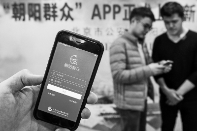 昨天,在北京市公安局朝陽分局舉行的新聞發(fā)布會后,市民體驗“朝陽群眾”APP。記者 鄧偉攝