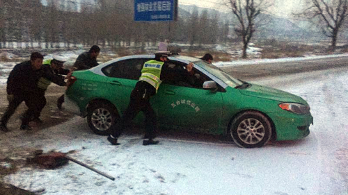 在全體民警的共同努力下,截至目前,轄區(qū)未發(fā)生重特大交通事故,未發(fā)生車輛擁堵,道路交通秩序安全暢通,得到了廣大人民群眾的一致贊揚(yáng)。圖為民警正在幫助司機(jī)推車 (張志遠(yuǎn) 楊海光)