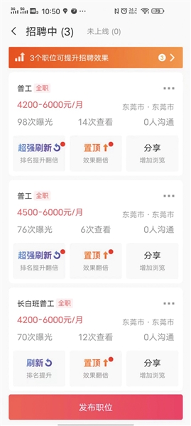 吳林提到,他們購買企業(yè)招聘賬戶后,還要花錢請(qǐng)人在招聘平臺(tái)上代發(fā)招聘帖,“發(fā)招聘帖特別嚴(yán)格,發(fā)不好就封賬號(hào),發(fā)帖后,怎么能在平臺(tái)上排到最前面,也是需要重點(diǎn)考慮的?!?/span>
