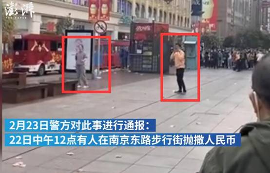 據(jù)澎湃新聞,2月22日12時(shí)左右,上海南京東路步行街有一男一女拋撒人民幣,民警接到報(bào)警后,將肇事男女帶走,并將地上的紙幣收回。初步調(diào)查,二人系姐弟,均于2019年4月被診斷為患有精神疾病。