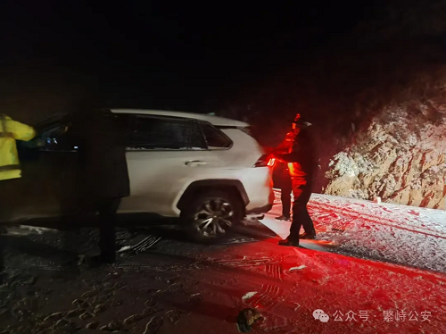 2024年11月25日晚18時,繁峙縣公安局指揮中心接到廣東游客趙岸華的報警求助電話,聲稱其一行四人駕車從河北來五臺山旅游,行至太行一號旅游公路神堂堡繁五交界路段時,因風雪交加、道路結(jié)冰,車輛和人員被困。接到報警后,指揮中心立即通知神堂堡派出所和交警中隊前往救助。救援民警頂風冒雪順著太行一號旅游公路沿路搜尋,經(jīng)過3個多小時的艱難跋涉,終于在神堂堡鄉(xiāng)盤道村往南約5華里的路上(已屬五臺山風景區(qū)地界)找到了被困車輛。當時該車燃油即將耗盡,車上四人凍得瑟瑟發(fā)抖,救援民警當即將3名乘客轉(zhuǎn)移至警車上,并協(xié)助拖車司機將被困車輛連上拖車后原路折返,最終在11月26日凌晨2時將被困游客和車輛安全營救回派出所。