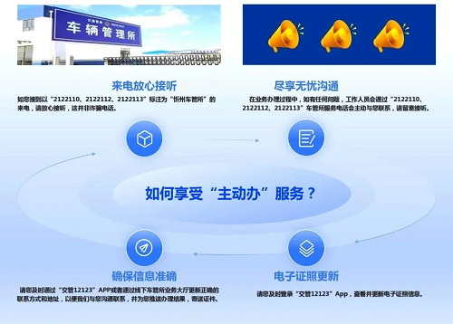 為了讓用戶更加安心地享受“主動辦”服務(wù),忻州市公安局交警支隊特別提醒廣大車主和駕駛員:當(dāng)您接到以“2122110、2122112、2122113”標(biāo)注為“忻州車管所”的來電時,請放心接聽。這些電話是車管所工作人員為了提供更加貼心、精準(zhǔn)的服務(wù)而撥打的,絕非詐騙電話。?