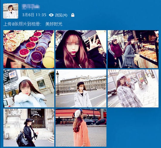 “最好找粉絲在10萬(wàn)以下的網(wǎng)紅?!痹谖⒉┥希簭?qiáng)嫻熟地搜到一個(gè)名為“Panny”的模特,點(diǎn)擊其關(guān)注的好友,找到類似幾名網(wǎng)紅,讓記者下載她們的照片,用修圖軟件清除圖片上的水印,再上傳到QQ空間。魏強(qiáng)在QQ上假扮的“白富美”網(wǎng)名叫“Eiffel”,他還煞費(fèi)苦心地更新“Eiffel”的QQ空間。