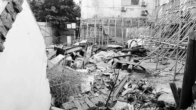 一節(jié)節(jié)鋼梁和木樁橫七豎八地堆在廢墟上,舊衣破被散落一地,已與凌亂的碎磚瓦一樣顏色,枯黃的蒿草更透著一股凄涼。幾十上百根黃色的鋼管密密匝匝地交織著,在僅有的堅(jiān)固地面落腳,努力頂住93號(hào)院南側(cè)和西側(cè)的4層白色樓體。