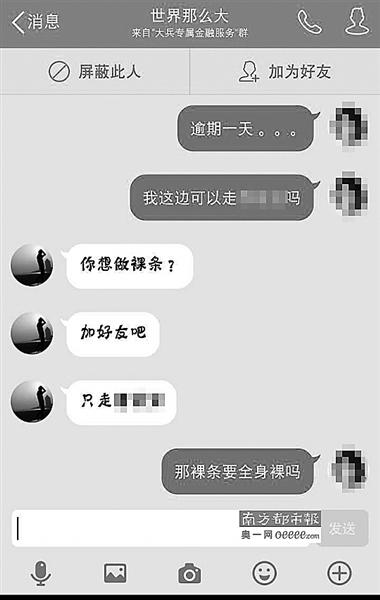 記者發(fā)現(xiàn),一些“裸持”借款的女大學(xué)生疑似遭遇出借人以“性服務(wù)”為目的的威脅,否則威脅稱要將裸照發(fā)送給借款人的父母、朋友。