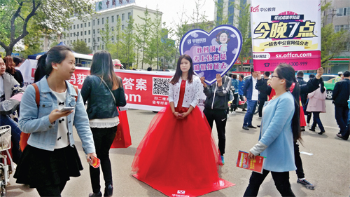 4月23日11點(diǎn)左右,記者在我市城區(qū)忻州一中校門口看到,一名身穿紅色婚紗裙的女生舉著牌子——“我媽說(shuō)了,考上公務(wù)員,咱們領(lǐng)證去”。當(dāng)天是2016年山西省公務(wù)員考試筆試的日子,這是一家公考培訓(xùn)機(jī)構(gòu)在考點(diǎn)附近進(jìn)行宣傳活動(dòng),宣傳者靚麗的外表、婚紗裙的著裝和新奇的廣告語(yǔ)吸引了很多考生的目光,甚至一些路人也駐足觀看。不過(guò),這種夸張的廣告詞,所謂的“考上公務(wù)員去領(lǐng)證”的想法是否正確,也應(yīng)該引起大家的反思。(許凈 攝)