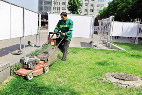近日,城區(qū)日月廣場上,園林工人正在對草坪進(jìn)行修剪。隨著氣溫增高,雨水充足,草坪和路邊的灌木生長茂盛,園林工人及時(shí)對草坪、灌木進(jìn)行修剪,保證了城區(qū)綠化帶干凈整潔。(張志遠(yuǎn) 攝)