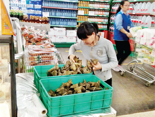 6月2日,市民在城區(qū)超市里買(mǎi)粽子、挑粽葉(張志遠(yuǎn) 許凈 攝)