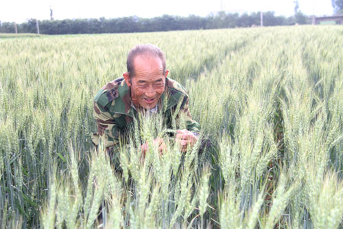 6月14日,農(nóng)民在原平市平地泉村地頭查看麥苗生長情況。該市積極引導(dǎo)農(nóng)民落實好一噴三防、拔草除雜等關(guān)鍵田管措施,確保種子純度。小麥進入飽滿期,長勢良好,豐收在望。(褚震 攝)