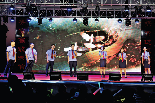 這場以“頌歌獻給黨,共圓中國夢”為主題的文藝晚會,是保安押運人精心組織,自編、自導(dǎo)、自演的一臺節(jié)目,就像該公司黨委書記陳志平所說:“這場文藝晚會是我們保安押運人向黨95歲華誕獻上的頌歌?!?月29日第一場晚會于晚8時正式上演,晚上7時便有觀眾陸續(xù)來到演出現(xiàn)場。第一場晚會就讓觀眾大呼過癮,節(jié)目形式多樣,有小合唱、獨唱、配樂詩朗誦、舞蹈、雙簧、小品、服裝秀等。其中舞蹈《映山紅》、男生獨唱《紅旗飄飄》、電聲樂隊《閃閃的紅星》歌曲串燒等用不同的藝術(shù)形式表現(xiàn)了保安押運人對黨和祖國的熱愛之情,感染了現(xiàn)場的觀眾;而雙簧表演《文武雙全》將晚會現(xiàn)場氣氛推向高潮,兩位表演者夸張的表情、搞笑的扮相引得觀眾連連叫好。