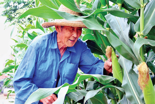7 月4 日,原平市武彥村老農(nóng)看著長勢喜人的玉米喜上眉梢:如今惠農(nóng)政策真是好,調(diào)動了俺們的種田積極性,利用科技種的玉米,長得好,結(jié)穗早,收入高,看著真開心。(趙春曉 攝)
