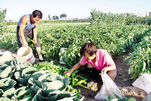 7月13日,原平市新原鄉(xiāng)解放街村農(nóng)民將收獲的青椒銷(xiāo)往市場(chǎng)。該市積極引導(dǎo)城郊農(nóng)民利用地理優(yōu)勢(shì),大力調(diào)整種植結(jié)構(gòu),加大特色農(nóng)業(yè)開(kāi)發(fā)力度,因地制宜種植紫甘藍(lán)、青椒等新鮮無(wú)公害蔬菜,不僅豐富了市民的菜籃子,而且鼓起了菜農(nóng)的錢(qián)袋子。(褚震 攝)