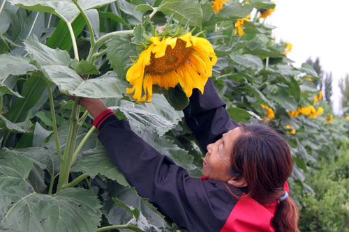 7月20日,原平市解放街農(nóng)民劉麗平正在長勢喜人葵花地里打支扣進行管理。該市積極引導(dǎo)農(nóng)民大力發(fā)展油料經(jīng)濟農(nóng)業(yè)種植,因地制宜、多措并舉,促使農(nóng)業(yè)增產(chǎn)農(nóng)民增收。(趙春曉 攝)