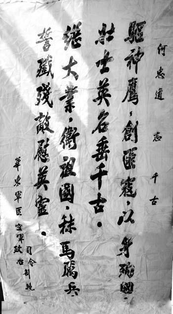 何忠道的犧牲,引起了整個空軍系統(tǒng)的震憾,人民空軍舉行了隆重的追悼大會??哲姍C關、華東軍區(qū)、生前所在部隊機關、戰(zhàn)友送了幾十幀挽幛。空軍司令員劉亞樓、副司令員常乾坤、副政委吳法憲、參謀長王秉璋聯(lián)名敬獻的挽幛上書:“殲滅美國侵略者,堅決保衛(wèi)祖國領空,為何忠道同志復仇!”華東軍區(qū)司令部、政治部敬獻的挽幛上書:“驅神鷹,創(chuàng)飛寇,以身殉國,壯士英名垂千古。創(chuàng)大業(yè),衛(wèi)祖國,秣馬厲兵,誓殲殘敵慰英靈?!?/p>