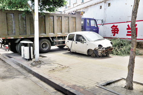 附近的居民們稱,人行道本來就不寬,這樣的“僵尸車”長年累月停放在路邊不僅有礙觀瞻,而且對市民的出行造成了不小的影響。記者認(rèn)為,這些“僵尸車”如果廢棄不用的話,就該進(jìn)行報(bào)廢處理,而不是一直停放在路邊。希望車主能夠盡快現(xiàn)身對車輛進(jìn)行處理,同時(shí)也希望交警部門能夠加大監(jiān)管執(zhí)法力度,讓“僵尸車”的身影不再出現(xiàn)在街頭巷尾。圖為廢棄的汽車。(王君 攝)