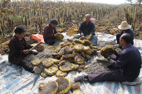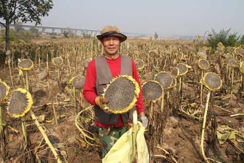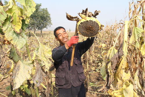 10月13日,原平市解村鄉(xiāng)圪坨村林同種植專業(yè)合作社正在收獲向日葵,該社引進三瑞公司種植1000余畝SH363向日葵喜獲豐收。近年來,該市積極引導農(nóng)民調(diào)整農(nóng)業(yè)產(chǎn)業(yè)結(jié)構(gòu),采取“合作社+農(nóng)戶”的模式,向日葵比玉米收入高四倍,銷售價每斤4塊左右,合作社為農(nóng)戶提供種子、種植技術(shù)等服務,帶動當?shù)厝罕娫鍪罩赂弧?span style="font-family: 楷體,楷體_gb2312, simkai">圖為解村鄉(xiāng)村民趁著秋高氣爽的晴好天氣,在田間地頭葵花籽的情景。(褚震 攝)