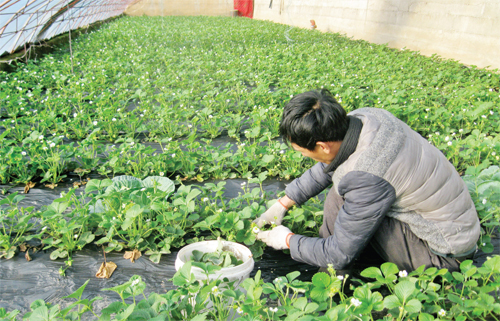 河曲縣農(nóng)民孫寶元利用日光大棚技術開展冬季草莓種植,3座日光大棚安排種植了早、中、晚熟三個品種。早熟品種將在新年開園,光是頭茬就預計能賣1萬元,草莓種植帶他駛?cè)肓酥赂坏目燔嚨馈?span style="font-family: 楷體,楷體_gb2312, simkai">圖為孫寶元正在大棚修剪草莓。(賈金理 攝)