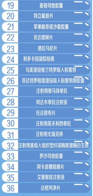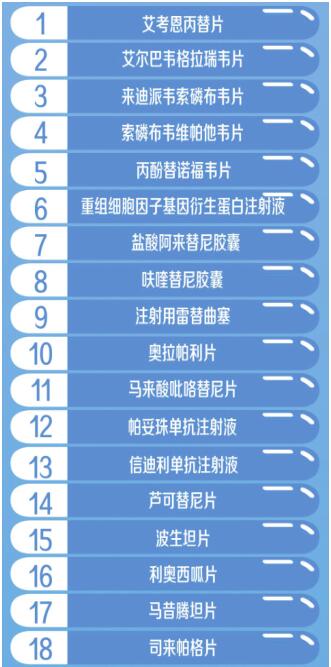 國(guó)家醫(yī)保局醫(yī)藥服務(wù)管理司司長(zhǎng)熊先軍介紹,此次談判成功的藥品多為近年來(lái)新上市且具有較高臨床價(jià)值的藥品,涉及癌癥、罕見(jiàn)病、風(fēng)濕免疫、心腦血管、消化等10余個(gè)臨床治療領(lǐng)域。重點(diǎn)領(lǐng)域的5個(gè)基本藥物全部談判成功,22個(gè)抗癌藥、7個(gè)罕見(jiàn)病用藥、14個(gè)慢性?。ê悄虿 ⒁腋?、風(fēng)濕性關(guān)節(jié)炎等)用藥、4個(gè)兒童用藥談判成功,進(jìn)一步優(yōu)化了目錄結(jié)構(gòu)。
