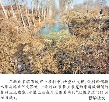 在華北某濱海城市一座村中,檢查組發(fā)現(xiàn),該村西側(cè)排水渠與鮑丘河交界處,一條約60米長、8米寬的渠道被傾倒的各種垃圾堵塞,水渠已經(jīng)成為名副其實的“垃圾水道”。而在該村東北水渠河長公示牌附近就有生活污水直接排入,水面漂浮綠色青苔、白色泡沫,散發(fā)刺鼻惡臭。