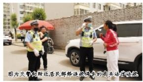 圖為交警向附近居民解釋違規(guī)停車的有關(guān)法律法規(guī)