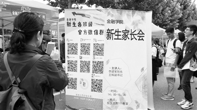 9月1日,中央財(cái)經(jīng)大學(xué)新生報(bào)到現(xiàn)場(chǎng),金融學(xué)院的學(xué)生邀請(qǐng)新生掃碼入群。李涓 攝